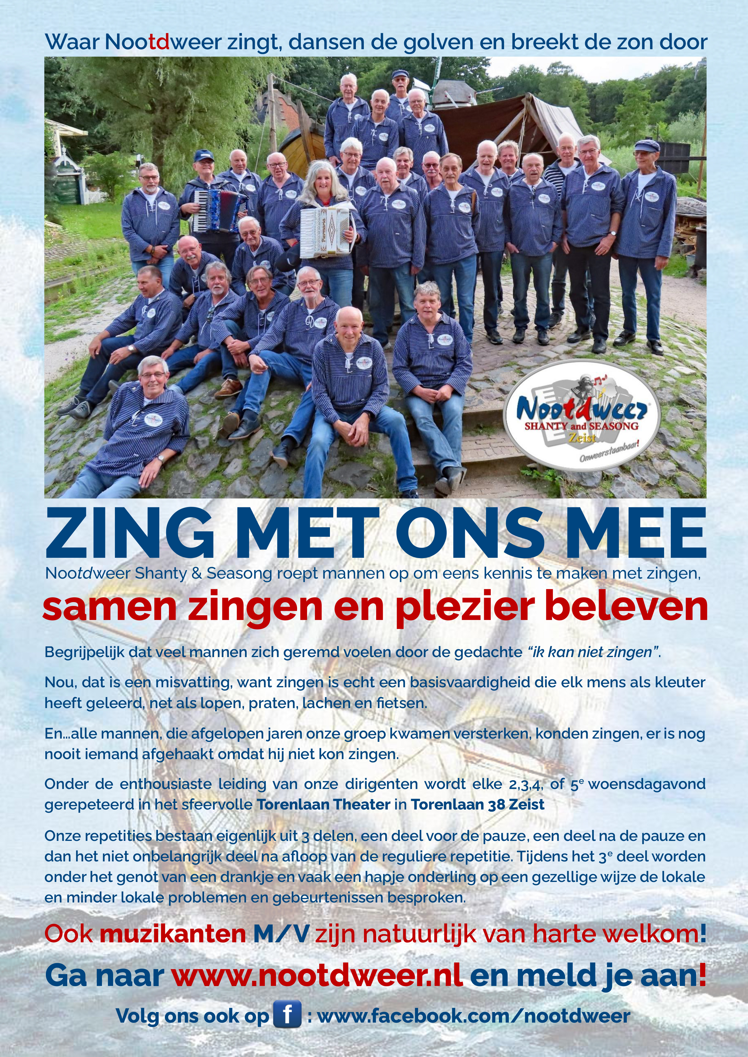 Nootdweer Shanty & Seasong roept mannen op om eens kennis te maken met zingen, samen zingen en plezier beleven.