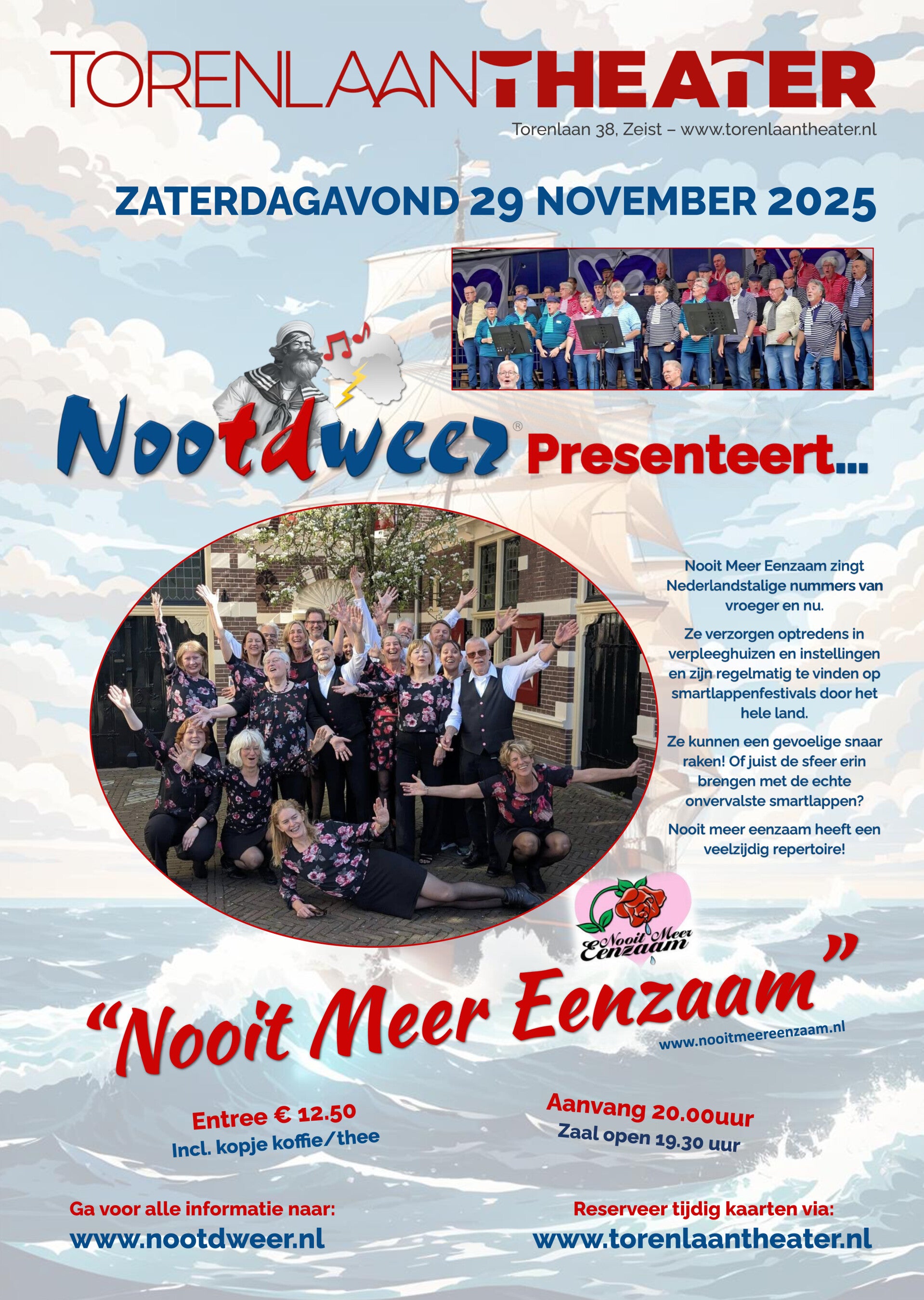 Het sfeervolle Torenlaan Theater was geheel uitverkocht en "Nooit Meer Eenzaam" heeft geweldige muzikale prestaties neergezet waar het publiek met volle teugen van heeft genoten! Ook Nootdweer liet zich niet onbetuigd en zo vormden dit een sprankelend geheel!